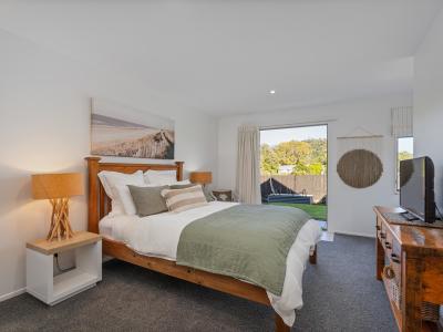The main residence features three bedrooms, two bathrooms including an ensuite, and a spacious living area which flows to the dining area and kitchen, designed for both comfort and connection. Comfort is assured year-round, with a wetback woodburner anchoring the living space, complemented by wall panel heaters downstairs, a heat pump in the master wing upstairs, a heat transfer system, solar hot water, and underfloor heating in the kitchen.