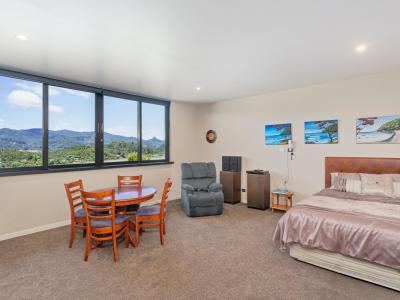As you step inside, you are greeted by a superb entrance foyer that sets the tone for the expansive living spaces that lie ahead. Spanning two levels, the extensive floor plan includes a massive open-plan lounge and dining area that invites natural light to flood the space through multiple sets of ranch sliders. This seamless integration with the outdoor decking area enhances the indoor-outdoor flow, making it perfect for entertaining or simply enjoying those splendid Coromandel sunsets.