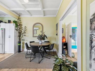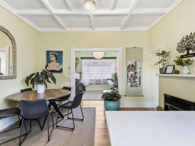 As you venture outside, you'll discover a lovely indoor/outdoor flow that connects the living spaces to a large covered deck. This inviting area is perfect for outdoor entertaining, dining, or simply enjoying a peaceful cup of coffee while soaking in the surroundings. The private backyard is a true haven, featuring established trees and a flourishing garden that offers shade and serenity, making it an excellent place for children to play or for gardening enthusiasts to indulge their passion.