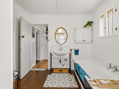 The home features three bedrooms. The heart of the home is the combined kitchen and dining area, designed for functionality and warmth, where family gatherings and casual meals can take place in a cosy setting. The renovated bathroom boasts a shower box, bath, and vanity, ensuring comfort and practicality, while a conveniently located separate toilet with outdoor access enhances the overall layout.