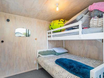 The home includes three bedrooms, with the master opening onto the front deck. A connected cabin, linked by the deck, provides a fourth bedroom suitable for guests, teenagers, or extended family. A garden shed and generous under-house storage provide plenty of room for beach gear and tools.