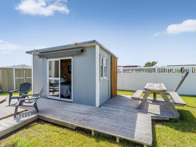The cabin configuration provides a bathroom, lounge, and kitchen area, plus a two-bedroom cabin and an extra single cabin. They're linked by a partly covered deck, giving the whole place a fun, glamping-style vibe that's perfect for weekends away.