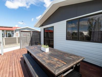 A welcoming front deck with pull-out privacy screens leads inside to a light-filled open-plan living space that feels both comfortable & functional. The dining area, complete with a heat pump, flows through to the lounge, where a freestanding fireplace & heat transfer system ensure the home is cozy year-round.