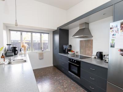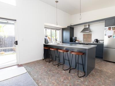 Step inside to a light-filled open plan living space where high ceilings, large ranch sliders & elevated windows enhance the sense of space & natural light throughout. Both chic & functional, the galley-style kitchen offers generous bench space, a breakfast bar, a dishwasher, & bi-fold windows that open directly to the patio — creating a seamless connection for entertaining or relaxed family meals.