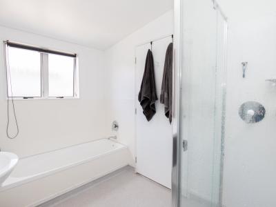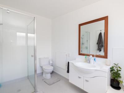 The spacious master suite is a peaceful retreat, featuring a walk-in robe, ensuite with a bathtub, & ranch sliders opening to a covered portion of the patio. Two additional double bedrooms, both with wardrobes, are positioned down a separate hallway alongside a generous family bathroom complete with a large shower, vanity & toilet.