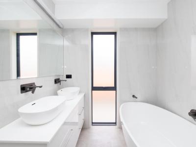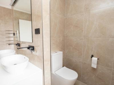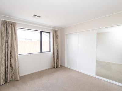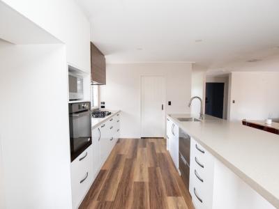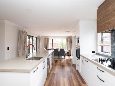 A 10-metre hallway leads to the bedrooms, creating separation & a sense of privacy. The master suite is a well-designed retreat, complete with a generous walk-in wardrobe & ensuite featuring floor-to-ceiling tiling, double vanity, spacious shower & toilet. A ranch slider connects directly to a sheltered deck, enhancing the indoor-outdoor flow.