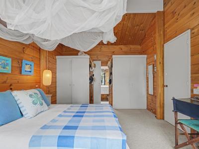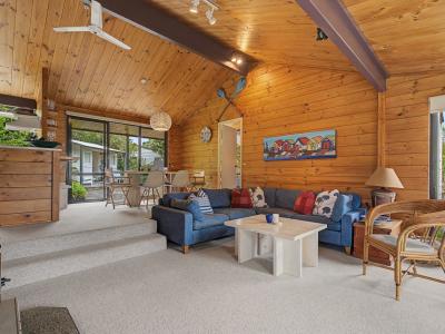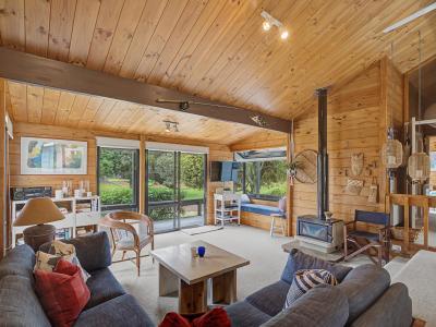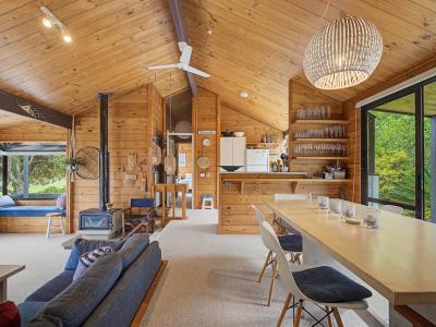 Entrance to this property is via a covered deck that leads you into the lounge—an open-plan haven that, while modest in scale, feels wonderfully light thanks to its wraparound windows. A wood fire sits confidently on the southern wall, ready to warm the entire home through winter days and evenings.