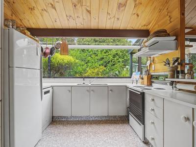 Two steps up take you to the kitchen and dining area. The kitchen, though original, is brightened by a clear bay window and provides generous room to create and entertain.