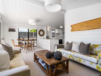 The double garage has been thoughtfully divided to create excellent storage along with a versatile sleep-out space for guests. Outside, easy-care gardens, an outdoor shower for rinsing off after the beach, and the expansive deck complete the relaxed coastal setting.