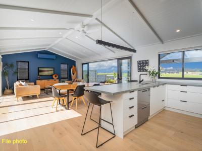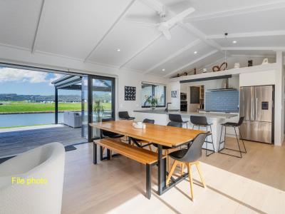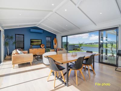 With wide canal views and fantastic light thanks to its strategic placement on the 742m² section, the striking interior is a perfect balance of function and flow with lofted ceilings and huge sliders on each side of main living space for optimal airflow, or enjoy a late afternoon tipple in the covered outdoor area with easy Zip track blinds.